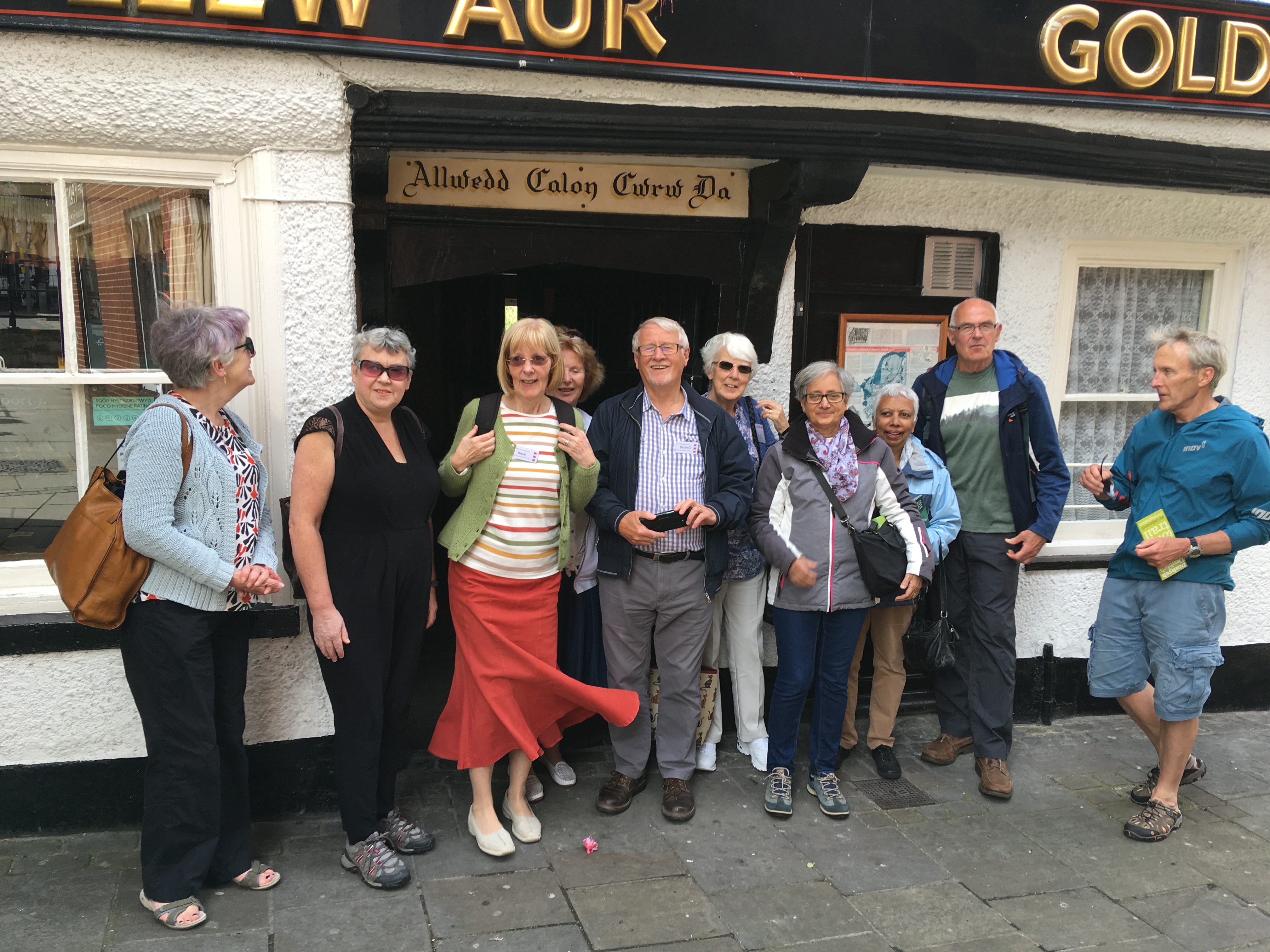 O flaen y Llew Aur ar ôl i Deborah gyfieithu’r geiriau uwchben y drws.
