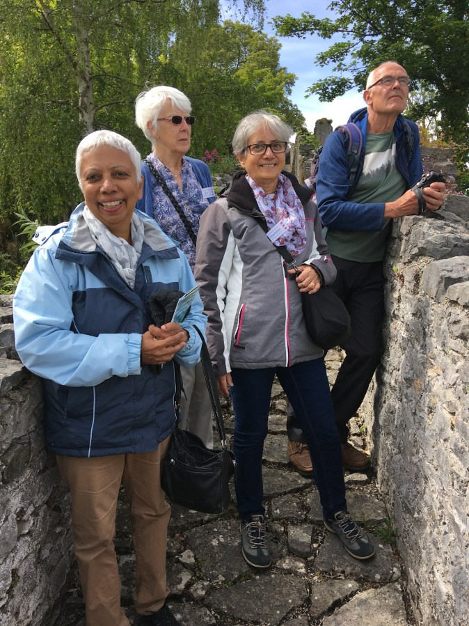 Herma, Eve, Charlotte a Steve yn mwynhau cerdded ar yr hen waliau.